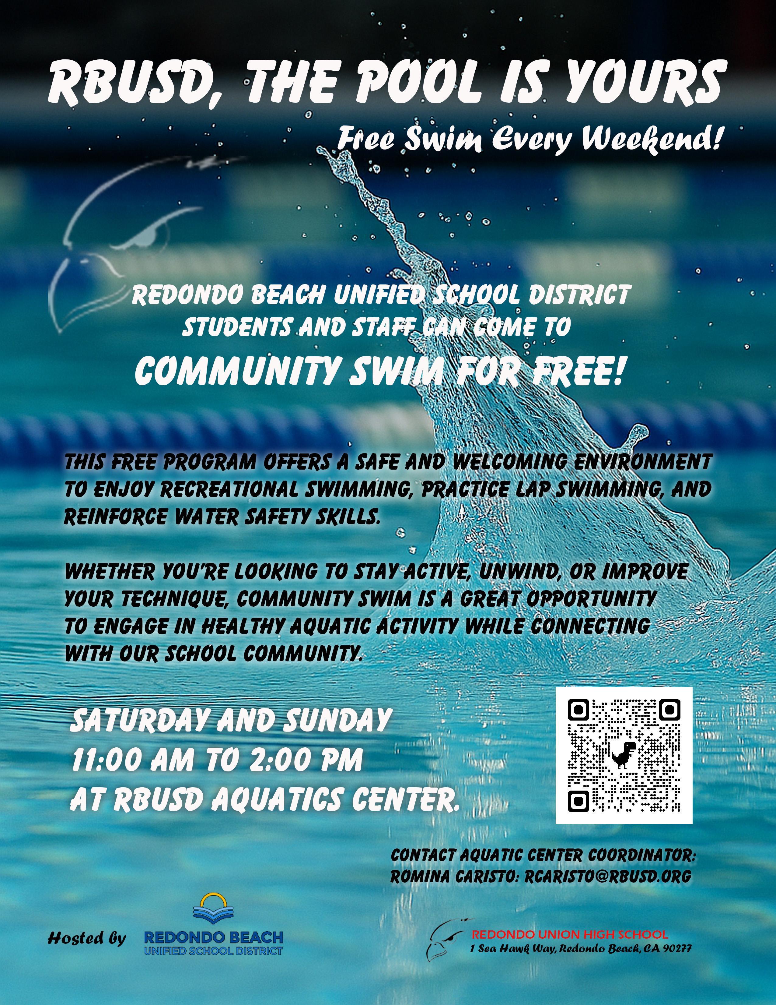 - RBUSD Students & Staff Community Swim for FREE every weekend. 11am-2pm Saturday’s and Sunday’s. See attached flyer for more details.