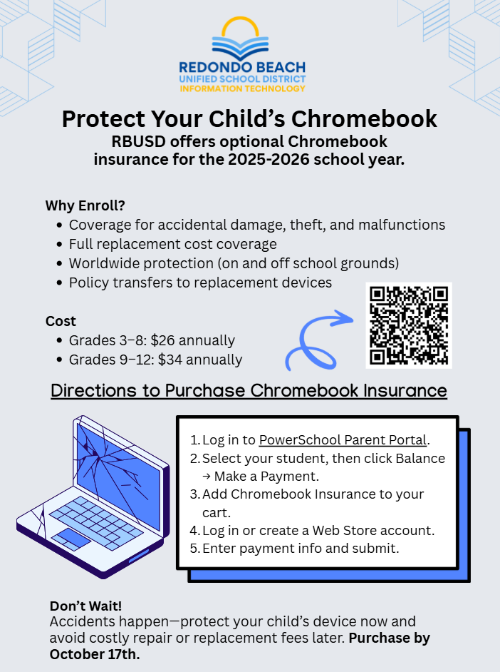 Chromebook insurance is available for purchase through PowerSchool until October 17. We encourage families to take advantage of this option to help cover accidental damage or loss and ensure peace of mind throughout the school year.
