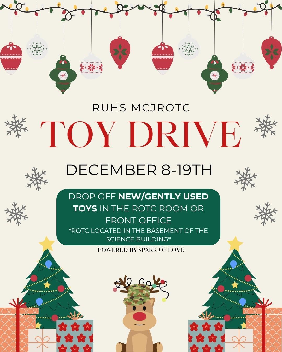December 8th-19th ROTC is hosting a toy drive. We are accepting new & gently used toys that can be dropped off in the ROTC room, or at the front office.
