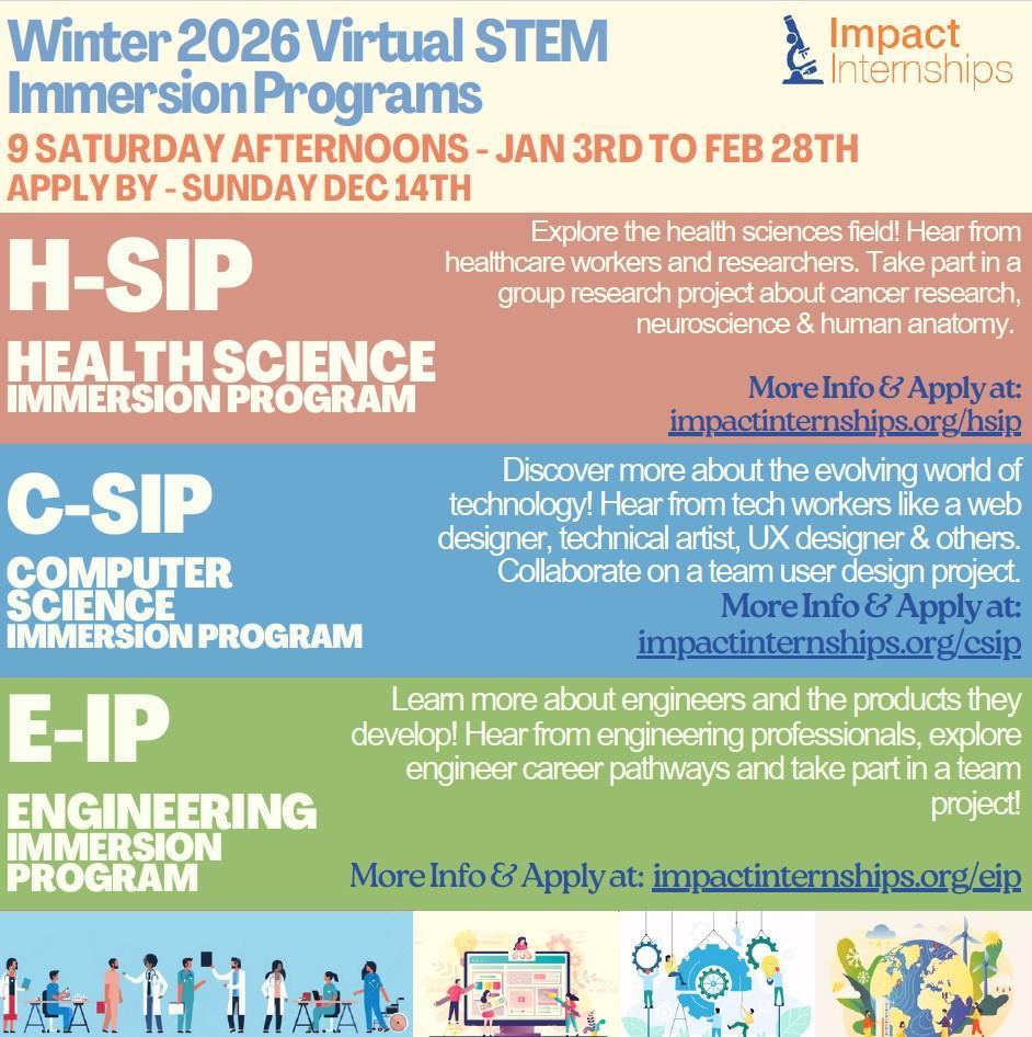 Impact Internships is offering virtual STEM immersion programs over nine Saturday afternoons from Jan 3rd to Feb 28th . In our Health Science Immersion Program (H-SIP) high school students hear from health professional speakers as they learn about the academic, research and professional care settings of the health sciences field. In our Computer Science Immersion Program (C-SIP), students explore the changing world of technology as we hear from tech professionals and explore fields such as coding, web development, software, and user design. In our Engineering Immersion Program (E-IP) we explore subjects such as chemical, civil and computer engineering.