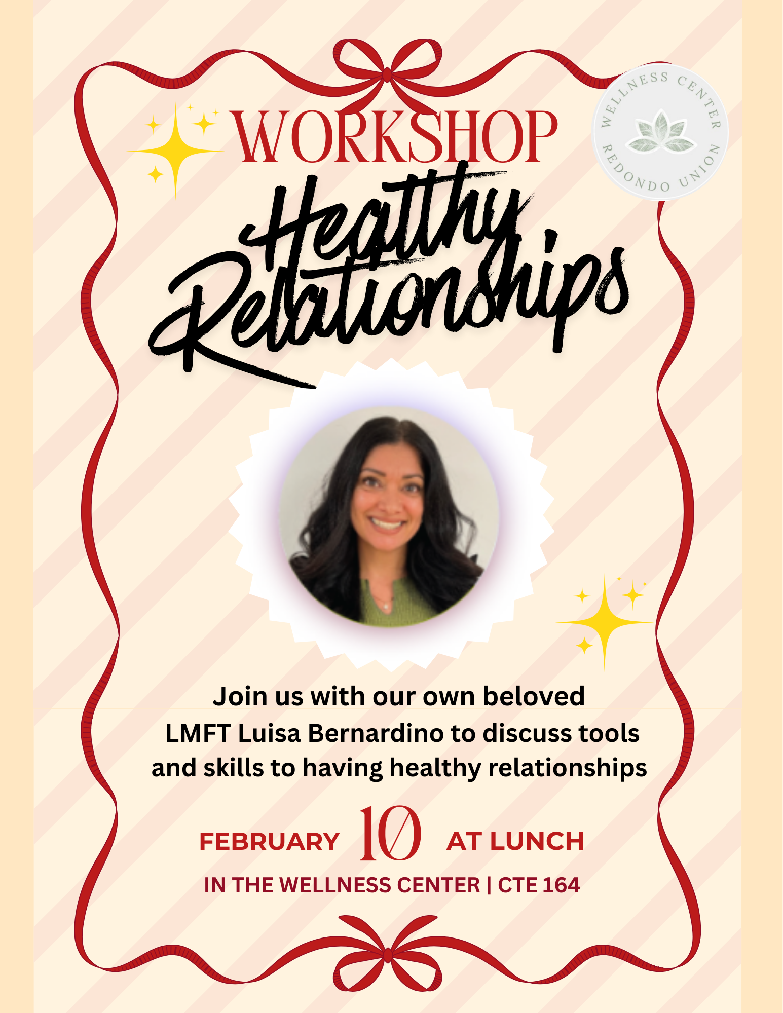 "Please join us in the Wellness Center next week February 10th @ Lunch for Healthy Boundaries Workshop! Learn to set boundaries, say no, and prioritize self-care. Snacks will be provided."