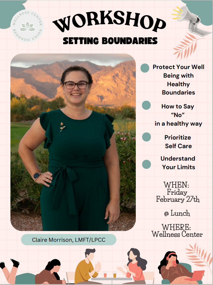 "Special Guest Speaker Claire Morrison LMFT/LPCC, will be joining us for a Boundaries and Healthy Relationships workshop February 27th @ Lunch in the Wellness Center! Snacks will be provided!